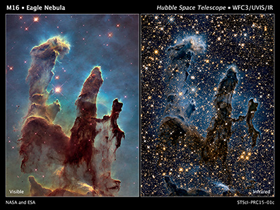 For example, HST observed protoplanetary disks; clumps of gas and dust around young stars that likely function as birthing grounds for new planets. One of the most famous is the Eagle Nebula (M16) or “Pillars of Creation".