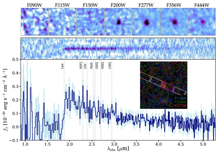 This figure shows the NIRCam (top) and NIRSpec (bottom) data for now-confirmed galaxy MoM-z14: the most distant galaxy known to date as of May 2025 – 33.8 billion light-years from Earth. Completely invisible at wavelengths of 1.5 microns and below, its light is stretched by the expansion of the Universe. Emission features of various ionised atoms can be seen in the spectrum, below, as well as the significant and strong Lyman break feature. Credit: R.P. Naidu et al., Open Journal of Astrophysics (submitted)/arXiv:2505.11263, 2025